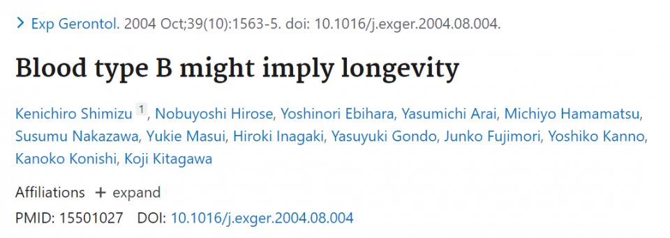 關(guān)于百歲老人的兩項(xiàng)研究發(fā)現(xiàn)是矛盾的。在269名日本百歲老人中,觀察到B型血者占比更高(29.4%)。與此相反,美國(guó)的研究得出結(jié)論,B型與其說(shuō)是與長(zhǎng)壽有關(guān),不如說(shuō)是早期死亡的標(biāo)志。